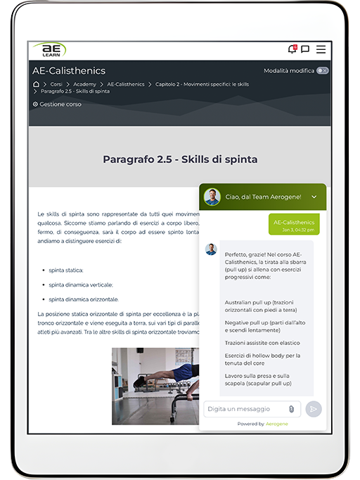 All’interno della piattaforma AE-Learn troverai Joe Trainer, un docente virtuale sempre al tuo fianco. Un supporto costante per rispondere ai tuoi dubbi, chiarire i concetti del corso e offrirti l’accesso all’immensa conoscenza di un’AI avanzata. Una guida interattiva e personalizzata che ti aiuta a progredire, senza mai lasciarti solo. AE-Learn è l’unica realtà nel settore fitness a offrirti un’assistenza così innovativa e completa. Con noi, il tuo successo è garantito!