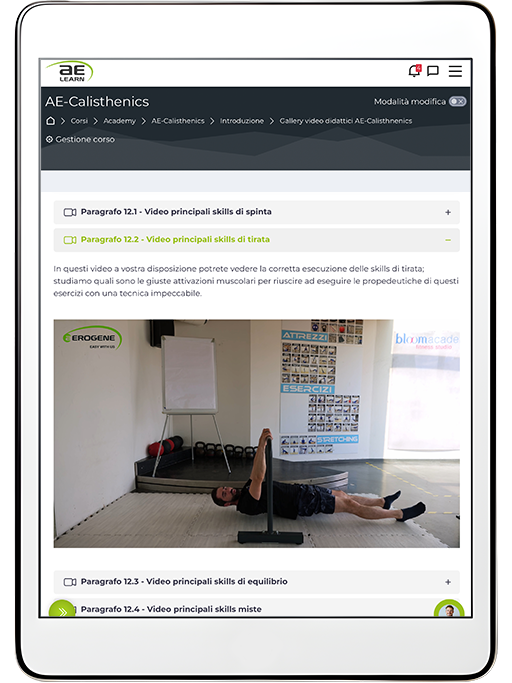 I corsisti di AE-Calisthenics potranno connettersi in diretta live via Zoom per non perdere nemmeno un passaggio, ovunque si trovino. Il giorno successivo alla lezione, verranno caricate le registrazioni del giorno precedente così da poter rivedere gli argomenti trattati. All’interno della piattaforma AE-Learn troveranno inoltre un’ampia raccolta di video on-demand, pensati per supportare ogni aspetto della formazione. Ogni contenuto è studiato per fornire le competenze necessarie a diventare istruttore di Calisthenics, con la massima flessibilità e qualità di apprendimento.