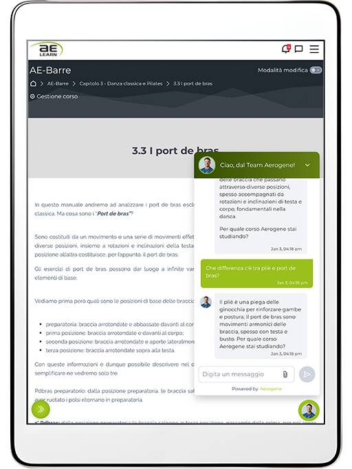 All’interno della piattaforma AE-Learn, docenti e studenti possono dialogare in tempo reale grazie alla chat live, disponibile ogni volta che sono connessi simultaneamente. Un’opportunità unica nel settore della formazione fitness, pensata per favorire il confronto attivo, risolvere dubbi immediati e studiare insieme. Niente più attese: con AE-Learn, l’interazione diventa il cuore dell’apprendimento, rendendo ogni lezione un’esperienza coinvolgente e personalizzata. Entra in un nuovo modo di vivere la formazione!