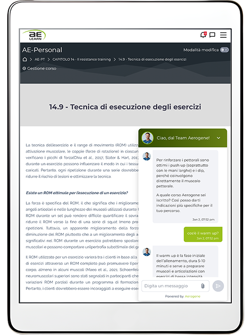 All’interno della piattaforma AE-Learn troverai Joe Trainer, un docente virtuale sempre al tuo fianco. Un supporto costante per rispondere ai tuoi dubbi, chiarire i concetti del corso e offrirti l’accesso all’immensa conoscenza di un’AI avanzata. Una guida interattiva e personalizzata che ti aiuta a progredire, senza mai lasciarti solo. AE-Learn è l’unica realtà nel settore fitness a offrirti un’assistenza così innovativa e completa. Con noi, il tuo successo è garantito!